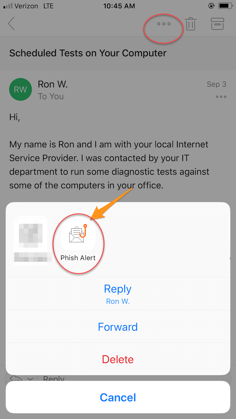 - If you want to report an email using the PAB, click the three dots at the top right of the screen, as shown below. (NOTE: iPhone: The 3 dots go left to right. Android: The 3 dots go up and down. )