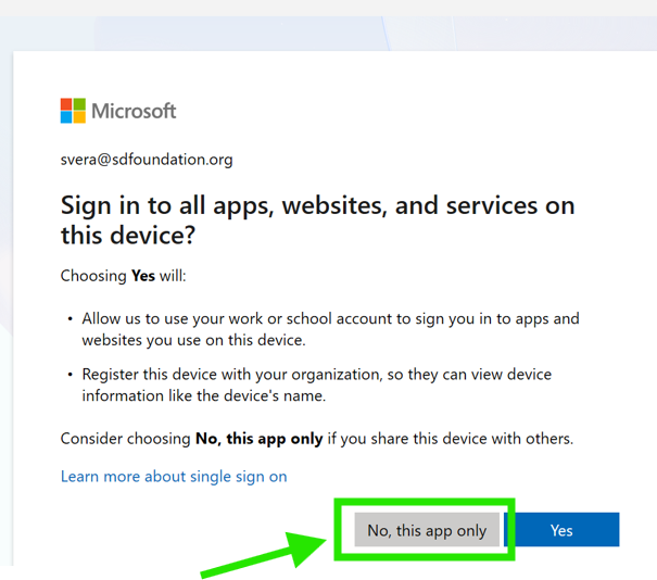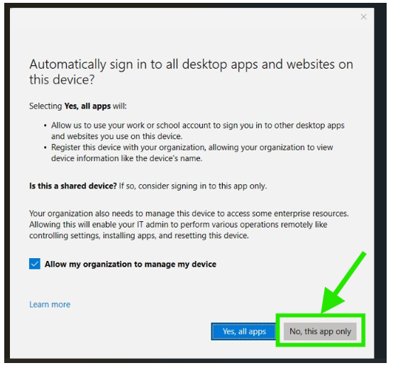 When prompted, select “No, this app only” after entering the password and approving or entering the Duo authentication code. This stops the sign-in loop and allows successful access.